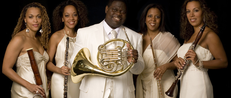 Imani Winds: (from left) Monica Ellis, Toyin Spellman-Diaz, Jeff Scott, Valerie Coleman, Mariam Adam. ‘We all as musicians want to touch the hand of God, we want to feel the divine, we want to be elevated,’ says group founder Coleman.On Solid Ground, In Unknown Lands