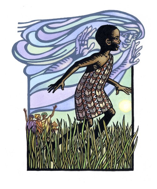 The Kirkus review adds that this is a "totally absorbing poetic celebration of loss and redemption." Indeed. "The pictures," wrote School Library Journal, "demonstrate the miracle of superb book illustration: how something that lies flat on the page can convey such depth, texture, and feeling." The Dillons' artwork, rendered in acrylics and watercolors, is haunting-boldly-outlined on a primarily Earth-toned palette and sometimes, as you can see in one of the illustrations below, depicting the slave traders as skeletons, faces of death.