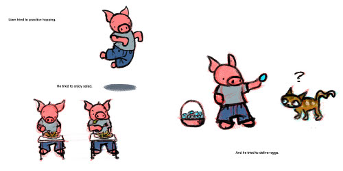 (Click to enlarge)As for the drawing process: that's perhaps the most difficult part to discuss, as I never know where to start and I have tried something different with every book I've done. With Piggy Bunny I completed three dummies before going to final art. In some ways, the book changed very little from the earliest dummy to the final one. I did my first one digitally, drawing the whole thing in Adobe Photoshop--something I've never done before and will likely never do again. While I like some of these drawings, they didn't help us see what the final book would look like. They helped with pacing and storytelling, though, so it wasn't wasted time. The biggest changes after this round came in the form of re-designing all the characters: smaller snouts, no clothes, and some other changes here and there.